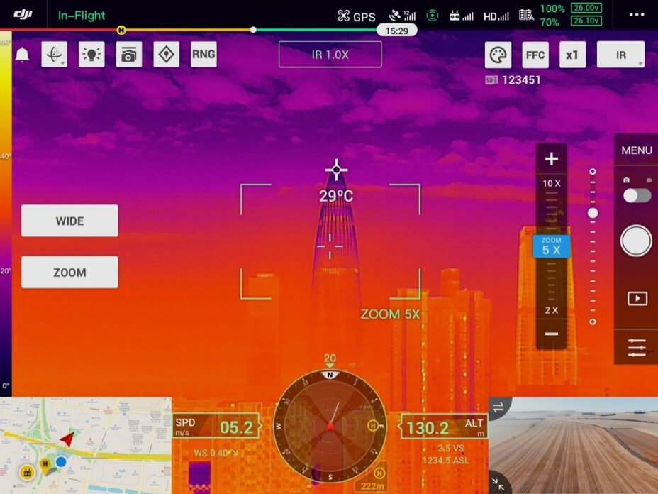 La nouvelle interface utilisateur vous permet de basculer rapidement entre la caméra grand angle, zoom et thermique, et donne un aperçu du FOV zoom en caméra grand angle ou thermique.